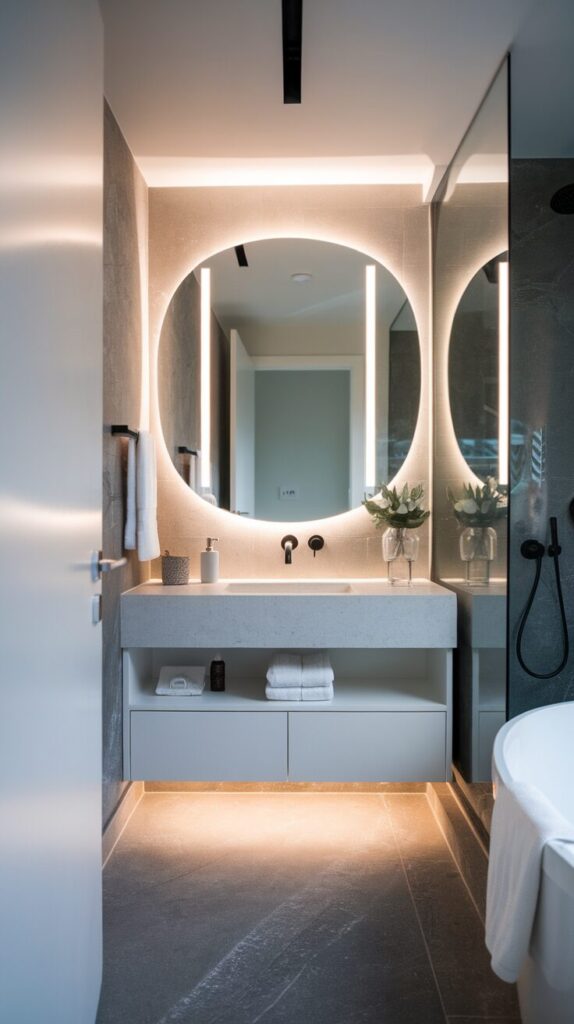 - Sconces or backlit mirrors for task lighting