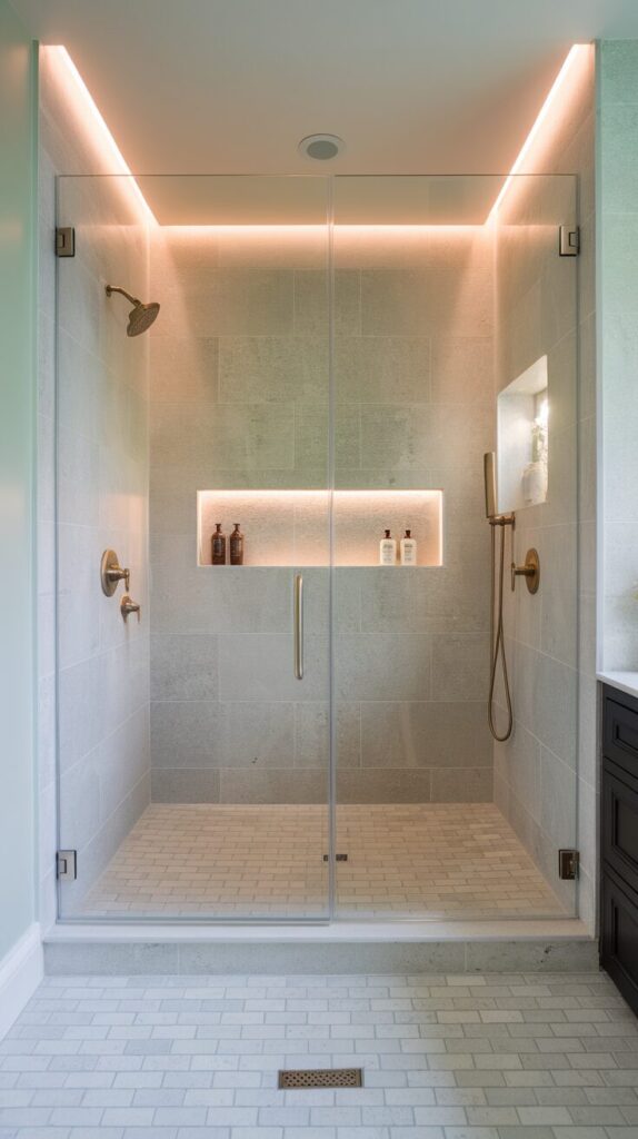 Add a linear drain along one edge for a sleek, uninterrupted surface. Built-in niches keep bottles organized and prevent clutter from ruining the vibe.