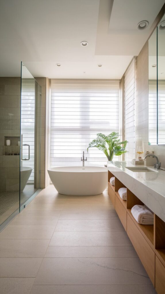 Large tiles create calm because they reduce visual interruptions. Fewer grout lines mean fewer distractions. That simplicity aligns perfectly with modern bathroom design principles.