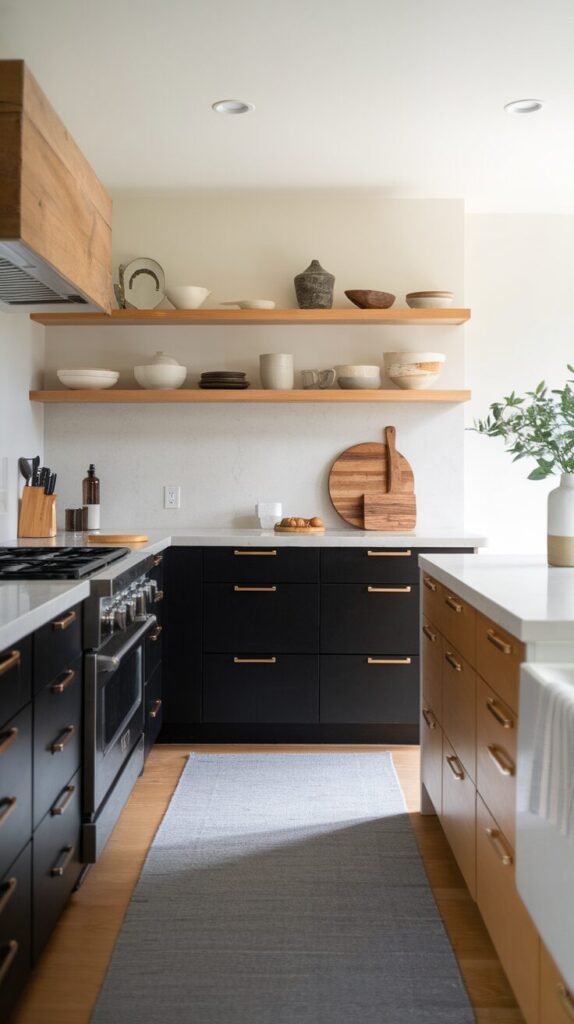 Use black to highlight focal points like islands, range hoods, or lower cabinetry. Keep prep zones bright enough to feel open and functional. When color placement follows the kitchen workflow, the design feels natural instead of forced.