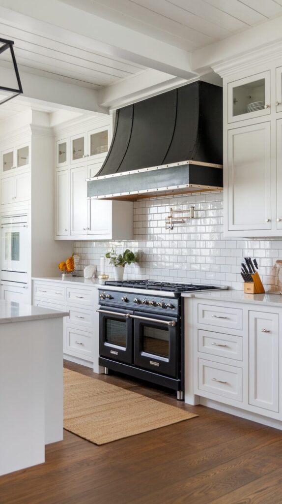 A black range hood commands attention. It anchors the cooking area. I love how it adds drama without clutter.