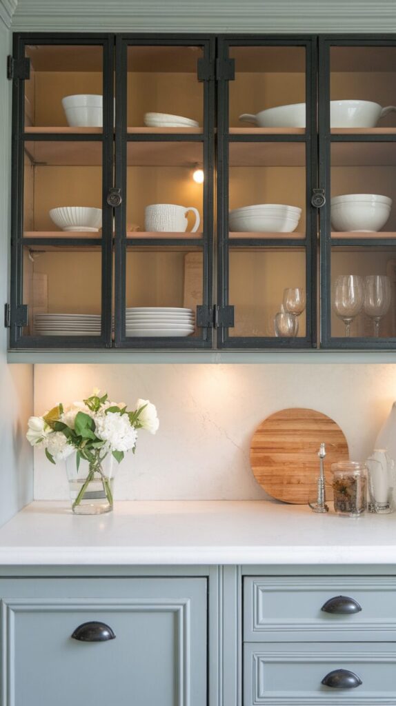 Glass cabinets add lightness, and black frames add structure. This combo feels elegant and airy. I use it to break up solid cabinetry.