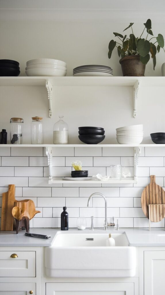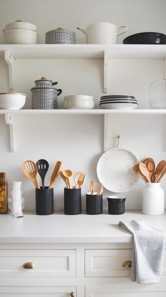 Open shelves look amazing when styled with discipline. Black and white keeps them calm instead of chaotic. I treat shelves like visual breathing room.
