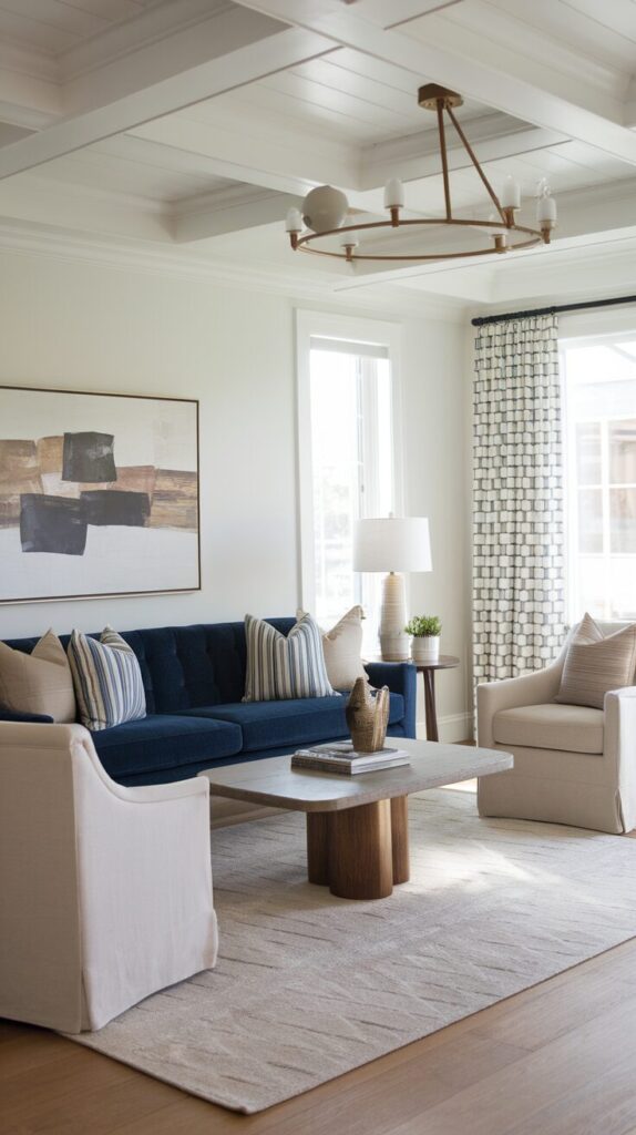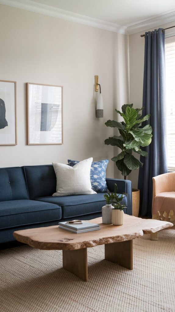 This idea works because warm neutrals soften blue’s cool energy without muting it. Beige, greige, soft taupe, or creamy sand shades let the sofa stand out while keeping the room grounded. I always recommend this setup for people who want color without visual chaos.