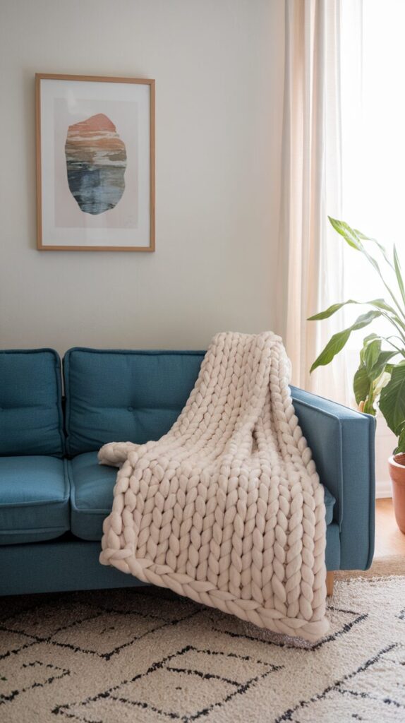 Blankets soften blue visually. They invite comfort. This idea feels effortless.