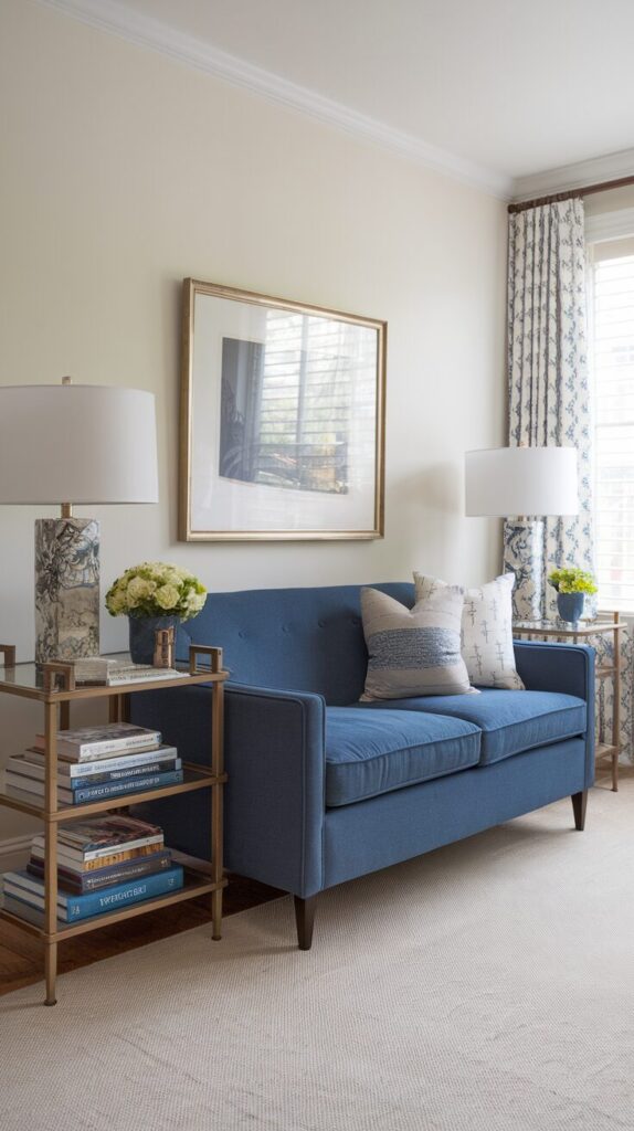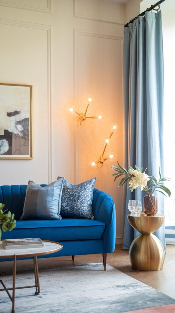 Metal accents elevate blue sofas without overwhelming them. Gold, brass, or black metals add contrast. This idea suits modern and transitional homes.