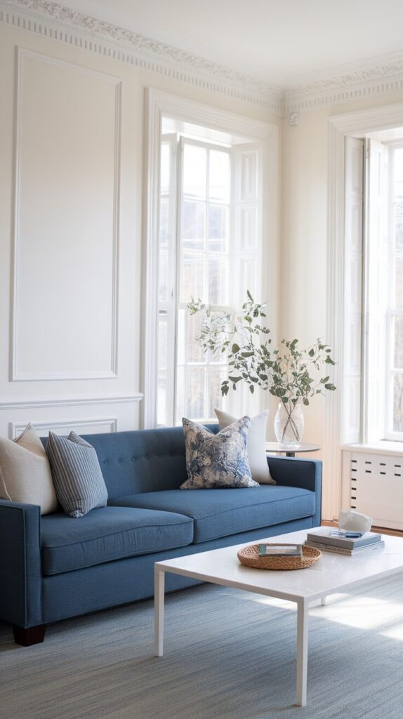 Blue sofas remain timeless because blue functions almost like a neutral in home design. Navy especially carries long-term appeal across modern, classic, and coastal styles. Smart styling keeps the look fresh for years.