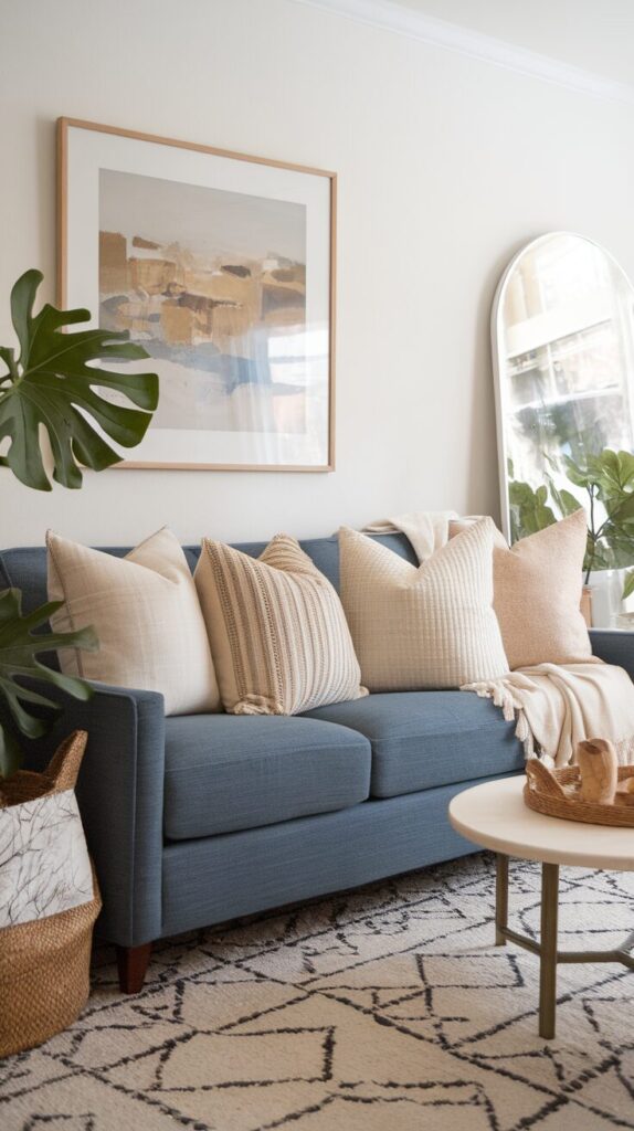 5. Blue Sofa With Mixed Throw Pillows That Feel Collected