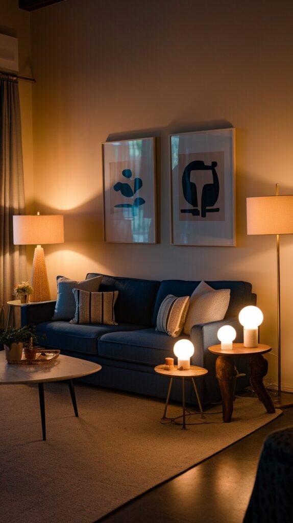 Table lamps, floor lamps, and soft bulbs create mood. Blue furniture shines under warm light. This setup feels cozy and intentional.