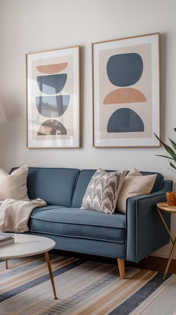 Artwork connects the sofa to the rest of the room. It balances visual weight. Blue appears intentional instead of random.