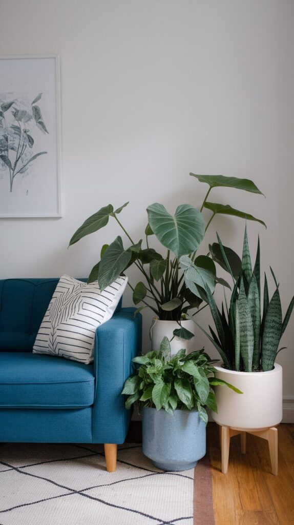 Plants saved my blue sofa setup. Green softened the color instantly. The room felt alive.