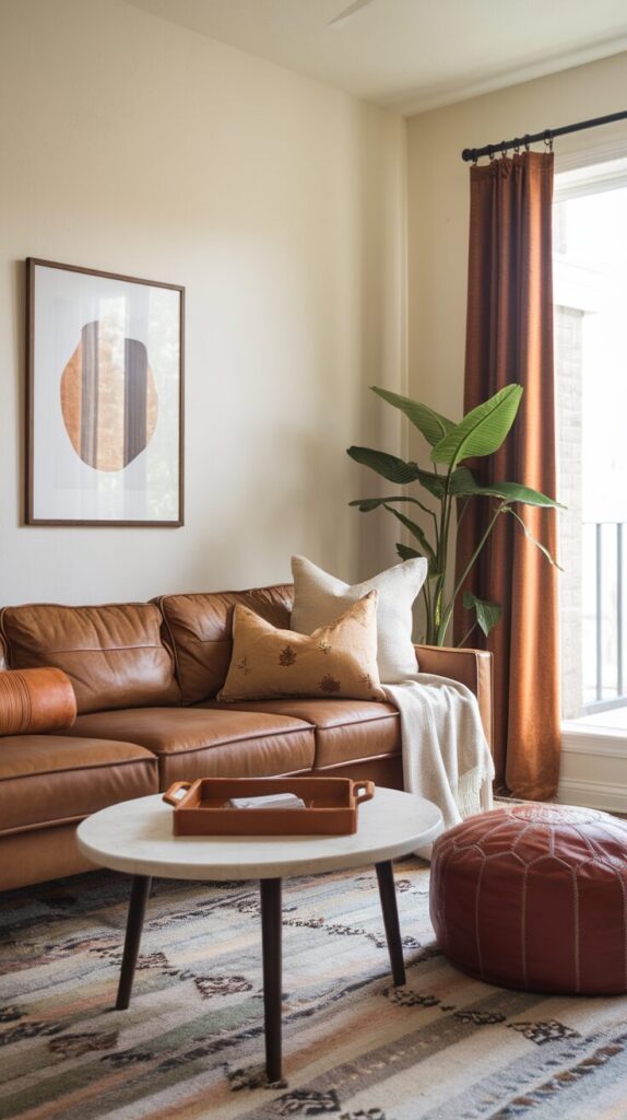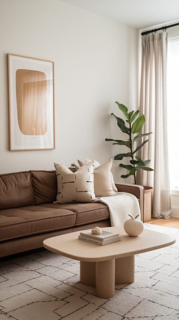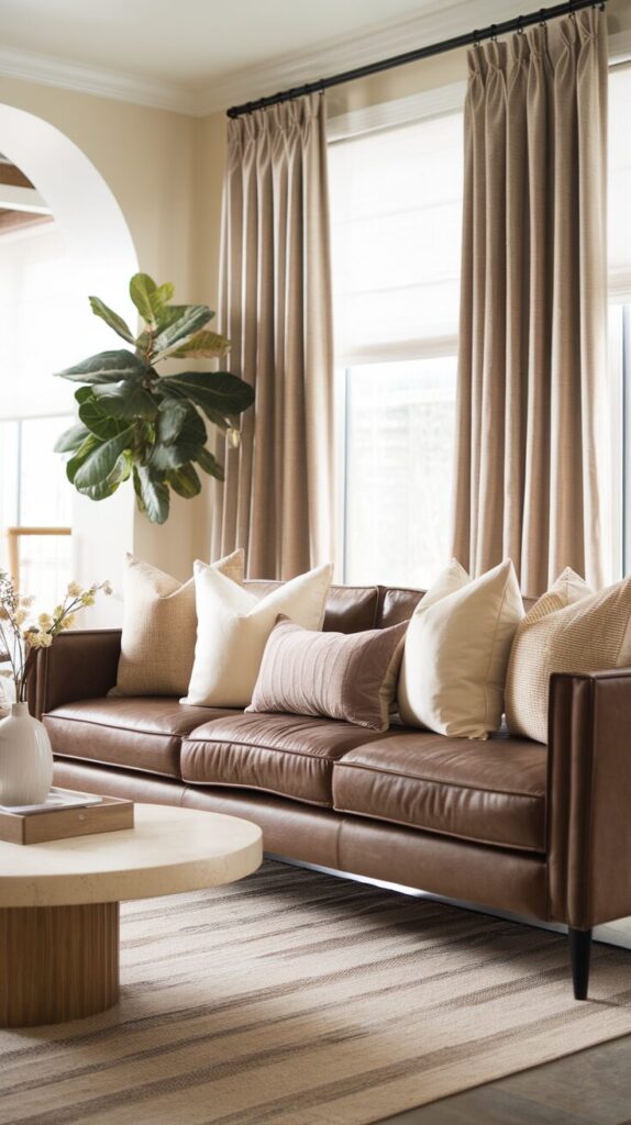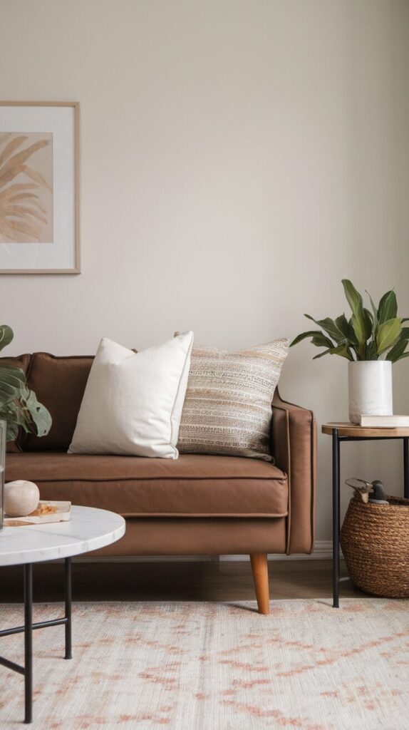 Leather near a brown sofa feels intentional. I add small leather accents for cohesion. The look feels elevated.