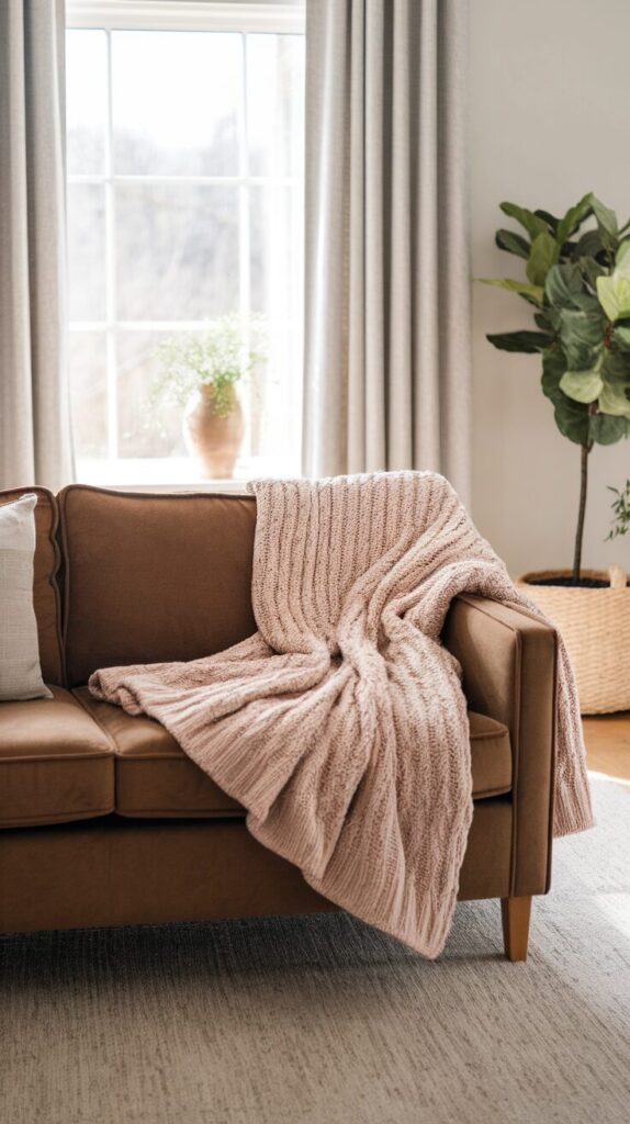 A brown sofa shines when it looks inviting. I toss a throw over one arm or corner for instant comfort. The room feels welcoming without trying too hard.