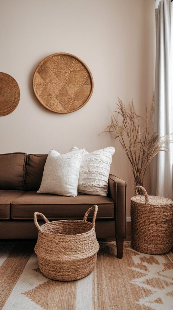 A brown sofa can feel flat when it sits alone with nothing breaking up the color. I always start with throw pillows because they fix that problem fast without locking you into a permanent look. Neutral pillows soften the sofa, add contrast, and make the seating feel styled instead of forgotten.