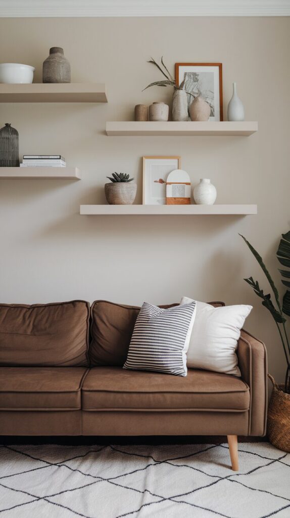 White walls make a brown sofa look intentional instead of dated. I’ve tested this combo repeatedly, and it never fails. The contrast feels clean, modern, and surprisingly cozy.