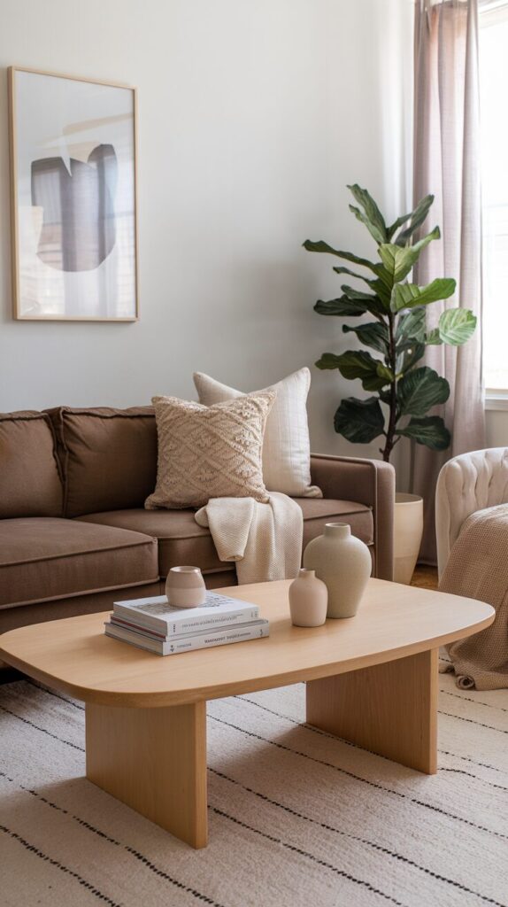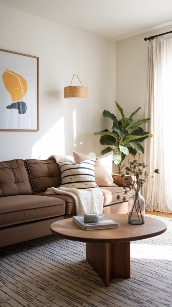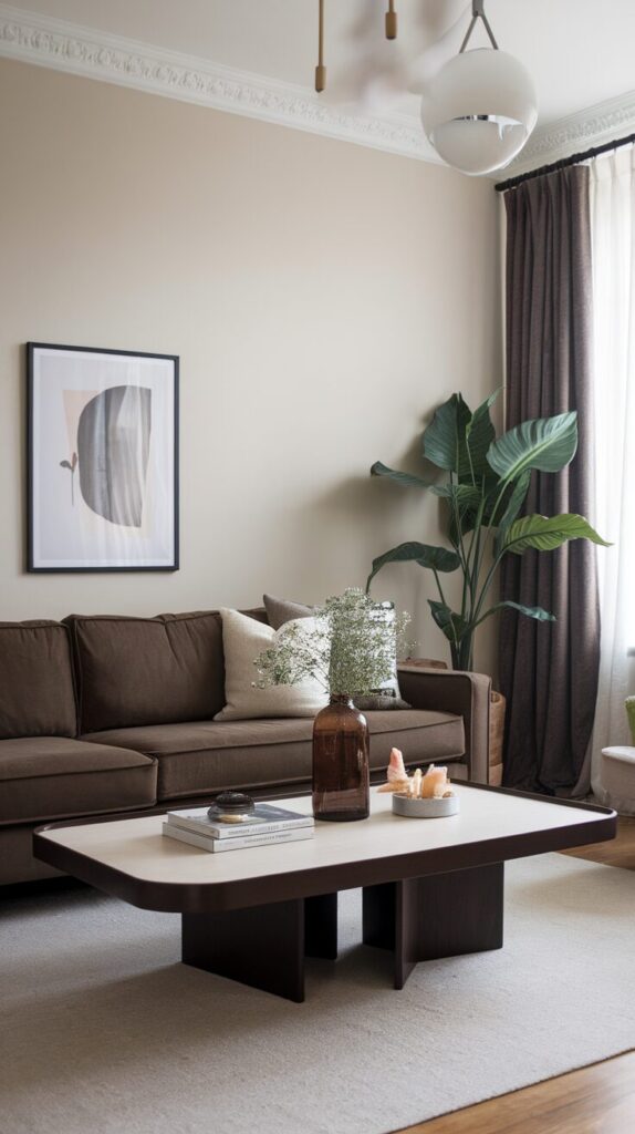 A brown sofa doesn’t need everything around it to feel light. I like adding one or two darker accents to ground the space. That contrast keeps the room from feeling washed out.