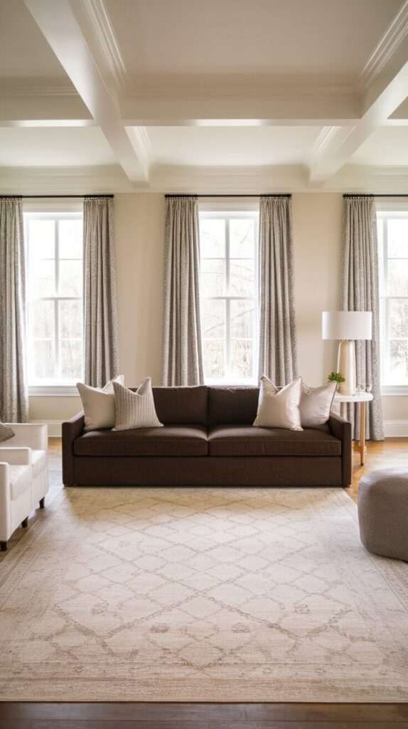 I’ve seen brown sofas drown in dark rugs, and the space always feels cramped. Light rugs give the sofa room to breathe and make the seating area feel intentional. You don’t need stark white, just something that contrasts gently.