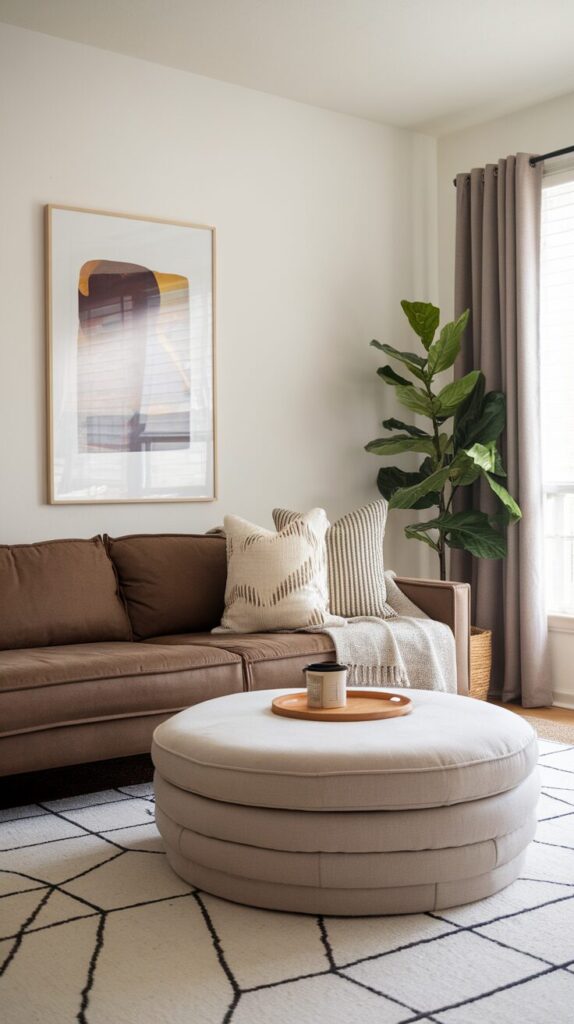 Ottomans pair beautifully with brown sofas. I love their versatility. They add comfort and function.