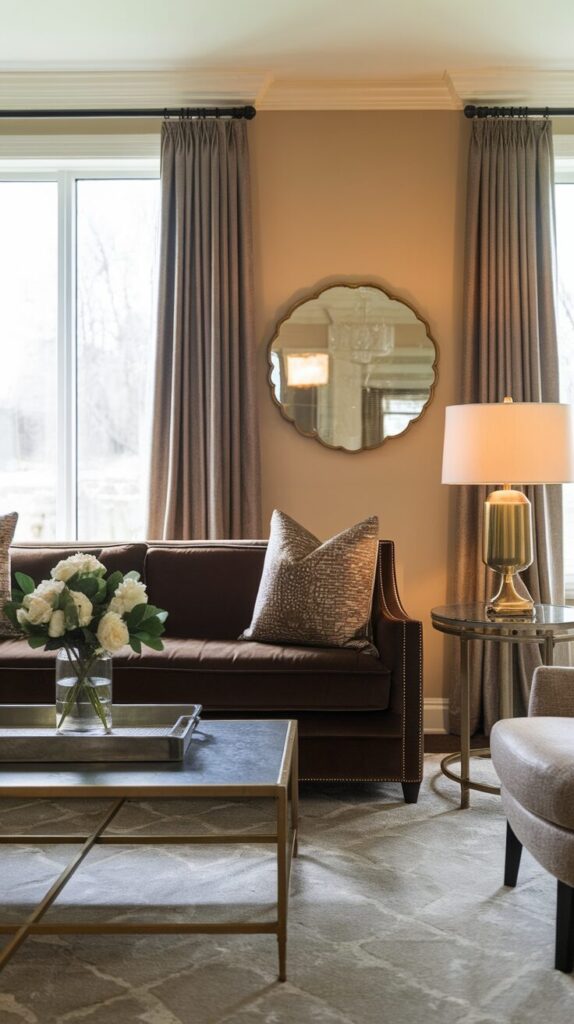 Brown sofas pair beautifully with metal when done carefully. I lean toward brass, antique gold, or matte black. Those finishes elevate the sofa instead of overpowering it.