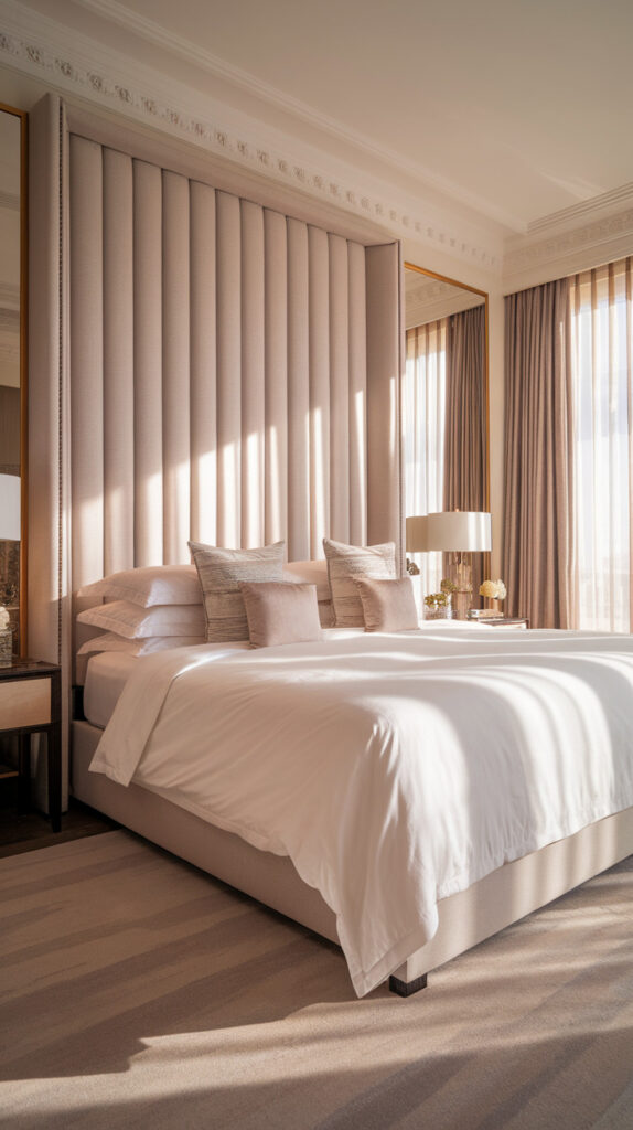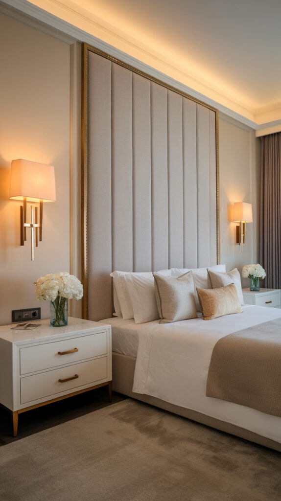 Most bedrooms look unfinished because the bed looks unfinished. A tall upholstered headboard instantly fixes that problem by giving the room a strong focal point, and it makes the bed feel more expensive without you changing anything else.