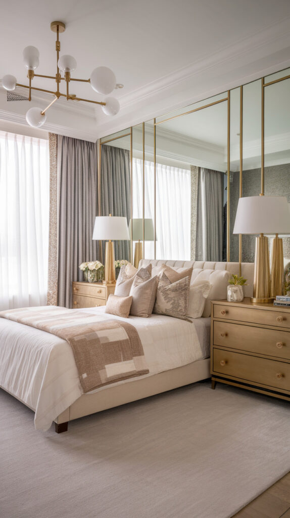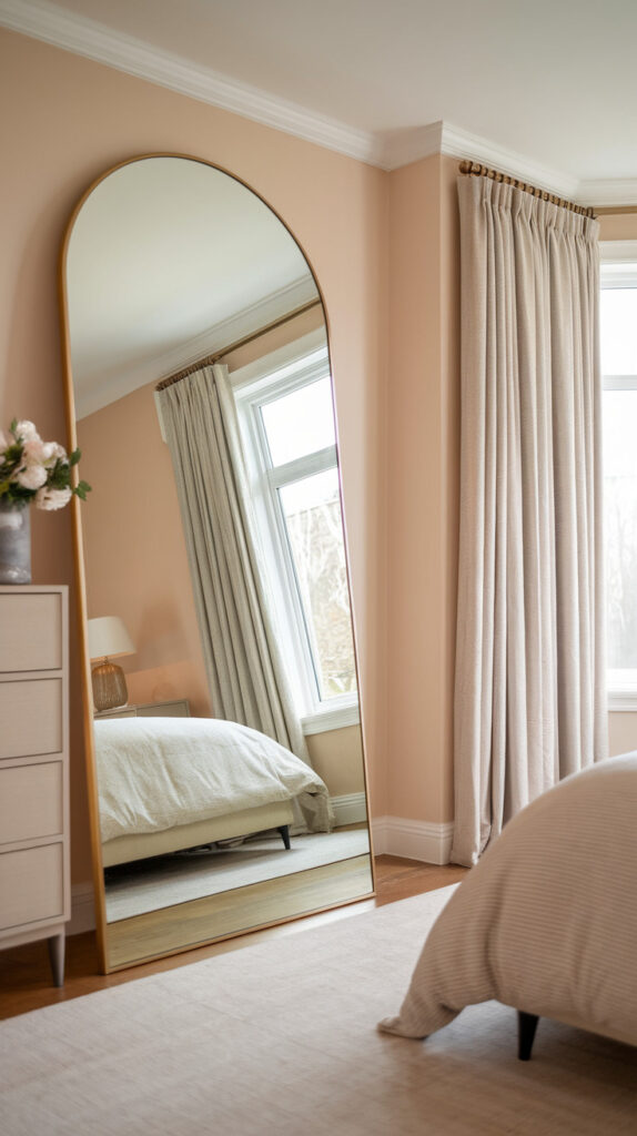 A mirror in the bedroom isn’t just practical, it’s also a design weapon. A large statement mirror makes the room feel brighter, bigger, and more polished. It also adds that elegant touch that makes a space feel styled, not just functional.