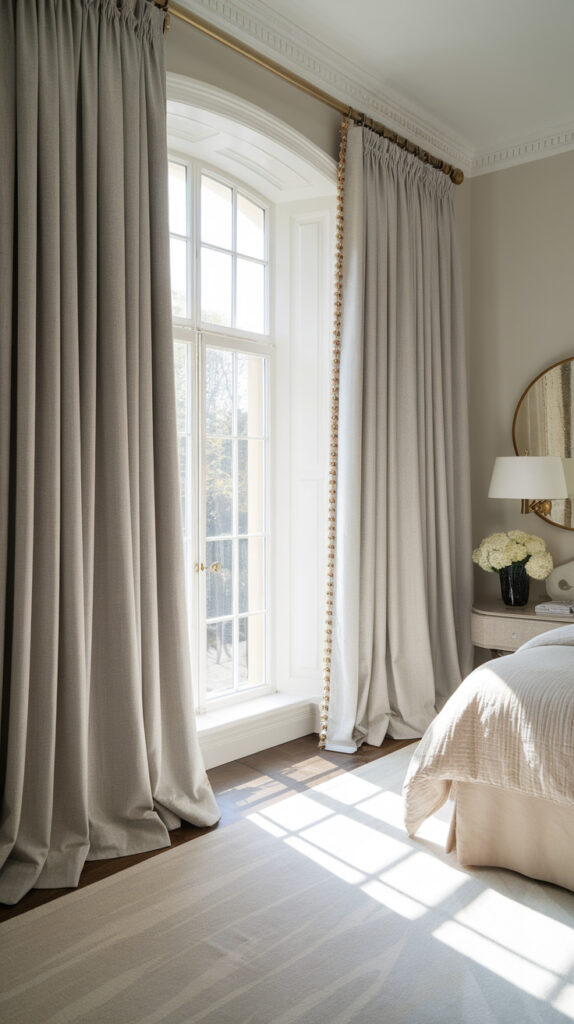 Short curtains are the design equivalent of wearing pants that are two inches too short. They technically work, but they don’t look polished. Floor-length curtains instantly make a bedroom feel taller, softer, and more expensive.