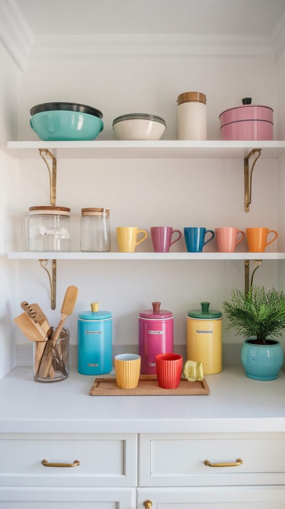 A color pop coffee bar adds energy to your kitchen. Bright mugs or a colorful machine can anchor the setup. I tried this once with deep blue mugs and loved the contrast.