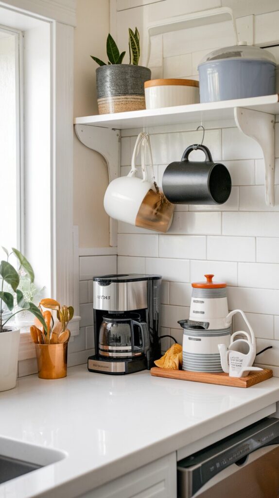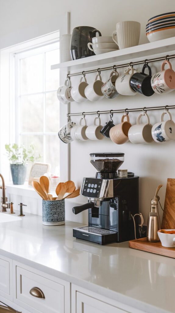 Display mugs on hooks or a small rack. Keep the rest of the setup simple to avoid visual overload.