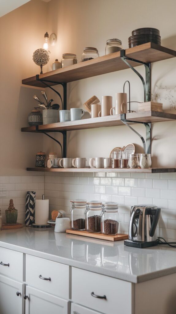 Floating shelves expand your coffee bar without stealing counter space. They also give you a chance to show off mugs and decor. I like how shelves create a layered look that feels intentional.