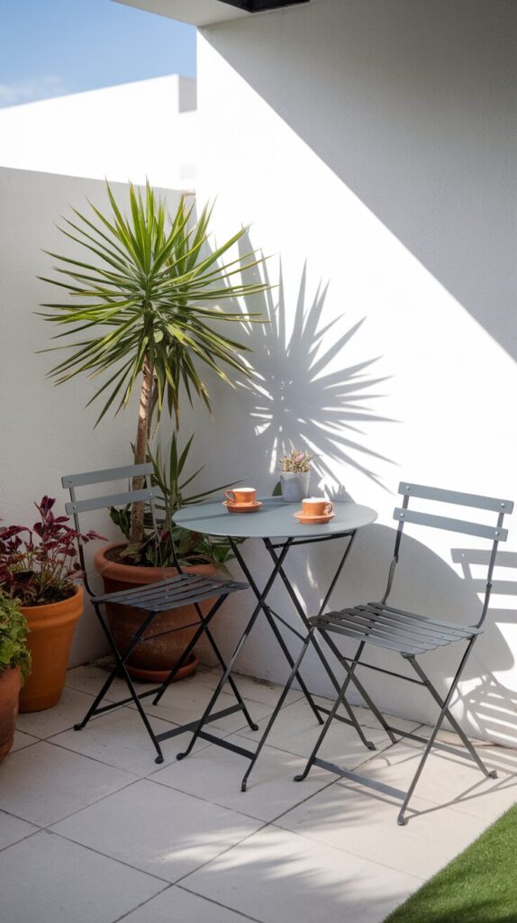 Not every patio needs a full dining table. A corner bistro set gives you a perfect spot for coffee, wine, or quiet conversations. This idea feels light, flexible, and refreshingly low-commitment.