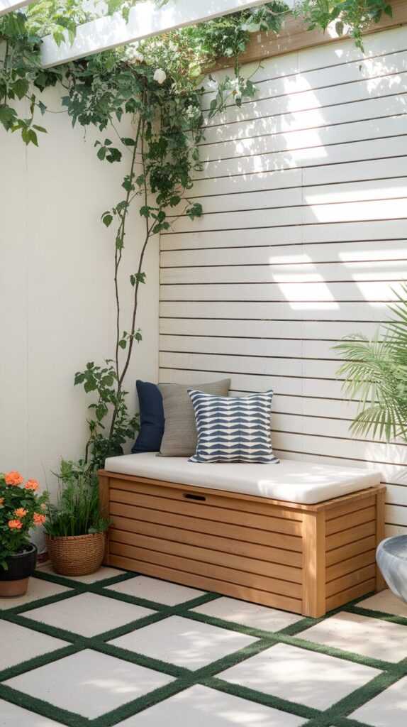 Match the bench color to your patio furniture. Simple lines look cleaner in small spaces. Avoid overly decorative designs that draw attention to storage.