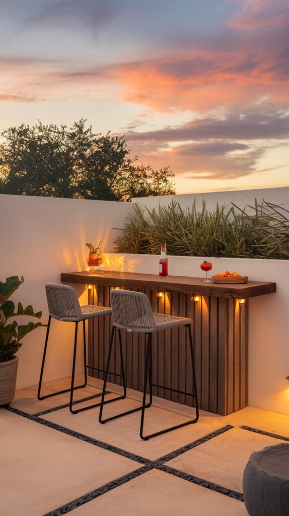 Corners make perfect bar zones. An outdoor bar tucked into a corner keeps traffic flowing while creating a fun focal point. This idea feels social without taking over the patio.