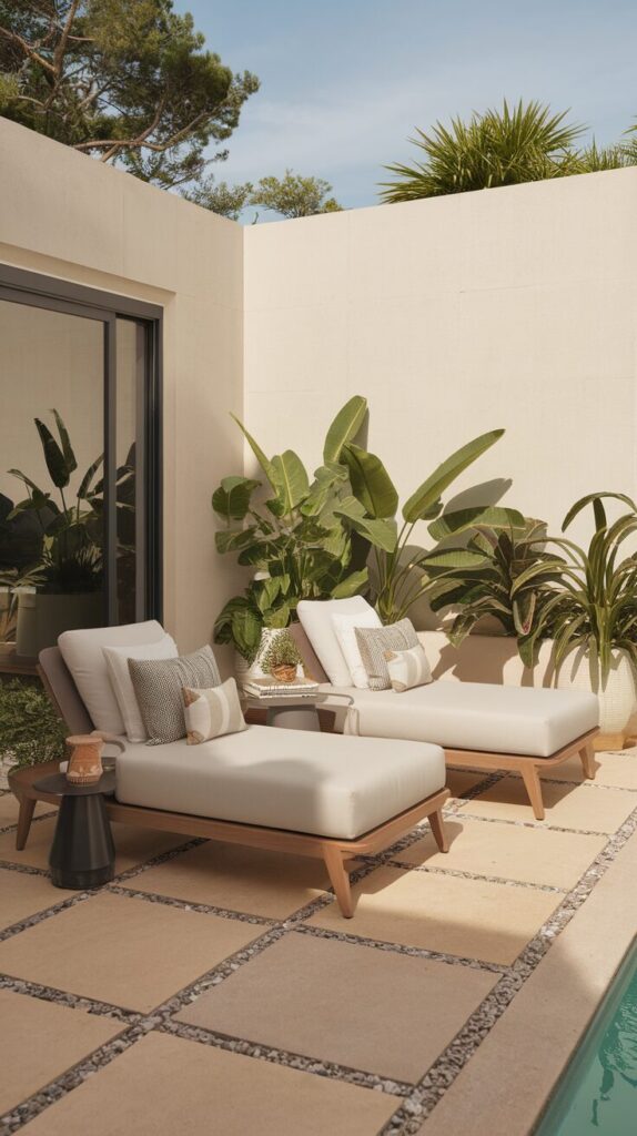 Sometimes simple wins. A pair of lounge chairs with a side table creates an instant relaxation zone. Corners help this setup feel intentional rather than random.