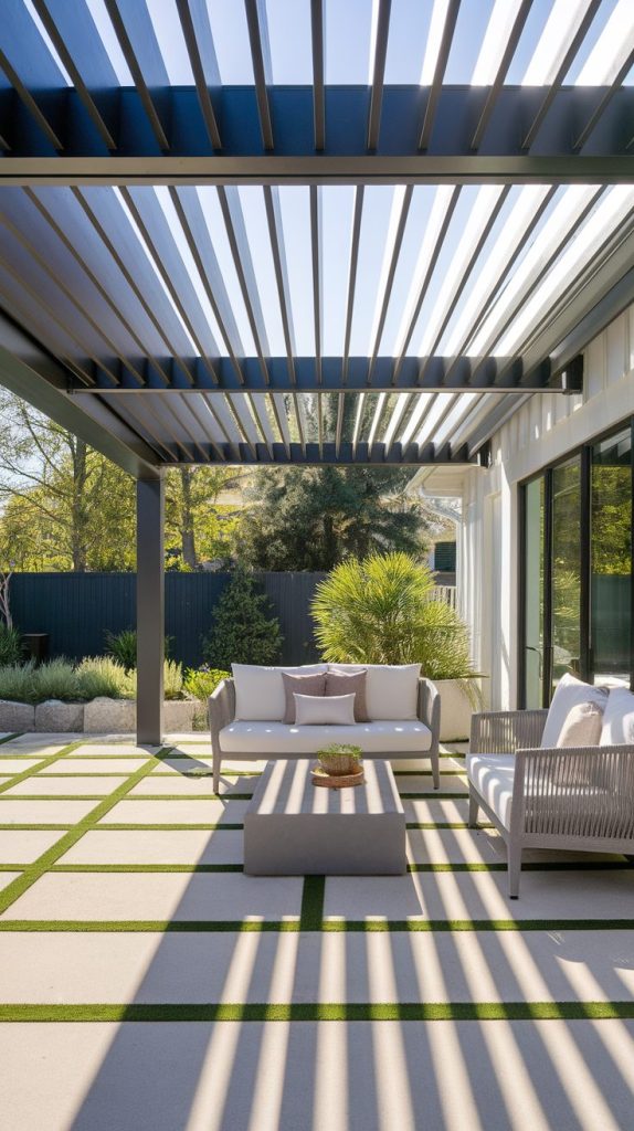 A pergola with adjustable slats gives you control, and I love anything that lets me decide how much sun I deal with. You can tilt the slats open on breezy mornings and close them when the afternoon sun turns aggressive. This setup feels smart and modern without screaming for attention.