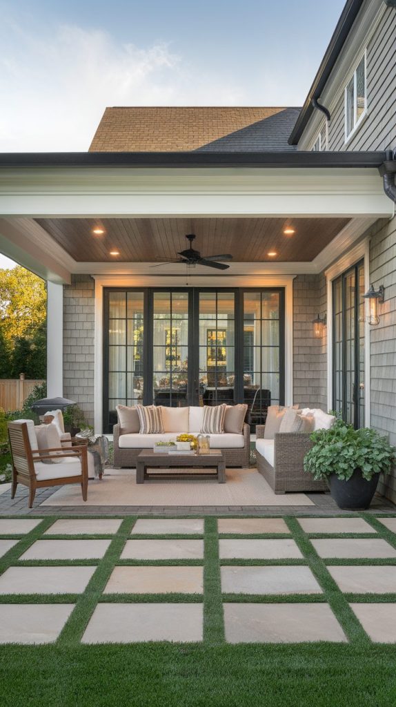 This type of covered patio connects directly to the house, which makes everything feel seamless. You walk outside, and the space still feels protected and familiar. That continuity matters more than people realize.