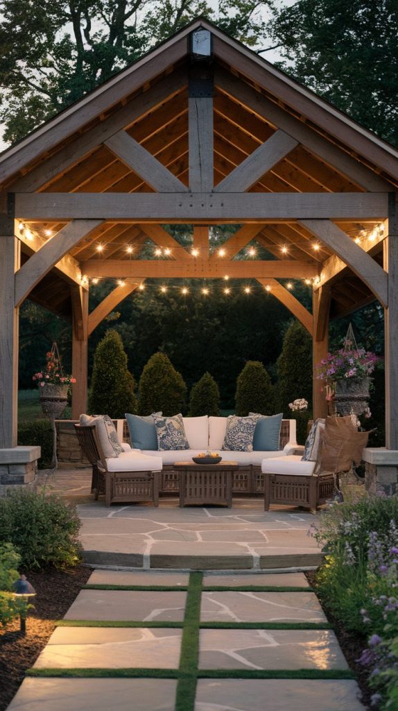 A wood pavilion creates instant warmth and character. I always feel relaxed under one because it feels grounded and cozy. The structure makes the patio feel like a destination, not just a space.