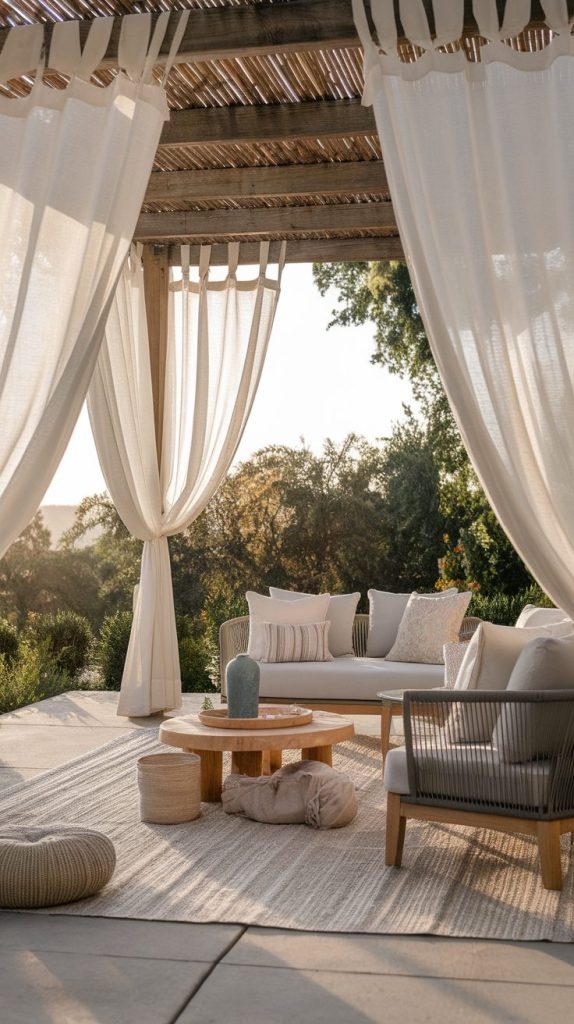 This idea pairs well with pergolas or solid covers. The curtains add layers and texture that elevate the whole design. If you want shade with personality, this approach feels effortless and charming.
