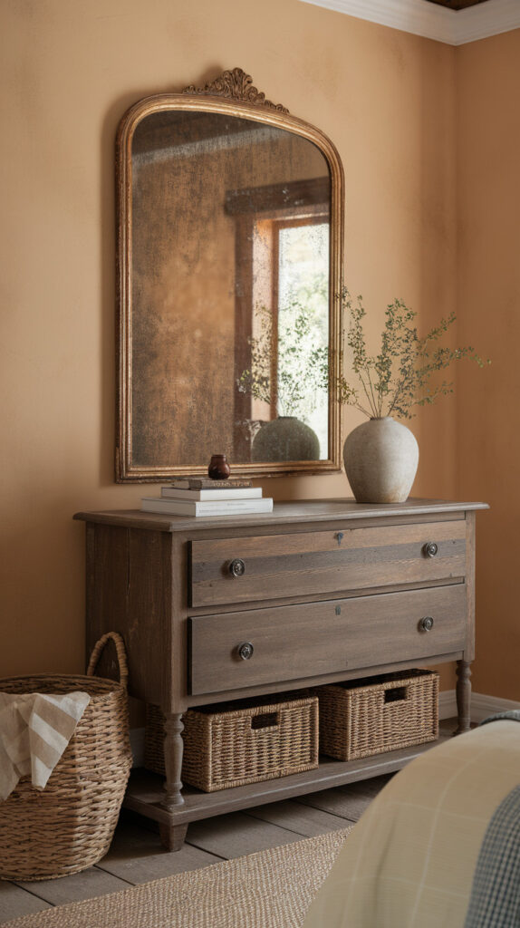 Country bedrooms always feel cozy when they look organized, but not overly sterile. Wicker baskets are perfect because they hide clutter while adding texture and warmth. They’re also ridiculously versatile, which is why people keep buying them like they’re collectible items.