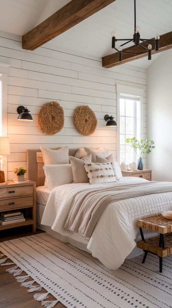 Not at all. Texture can come from bedding, rugs, wood furniture, or woven baskets. Shiplap is optional, not mandatory.