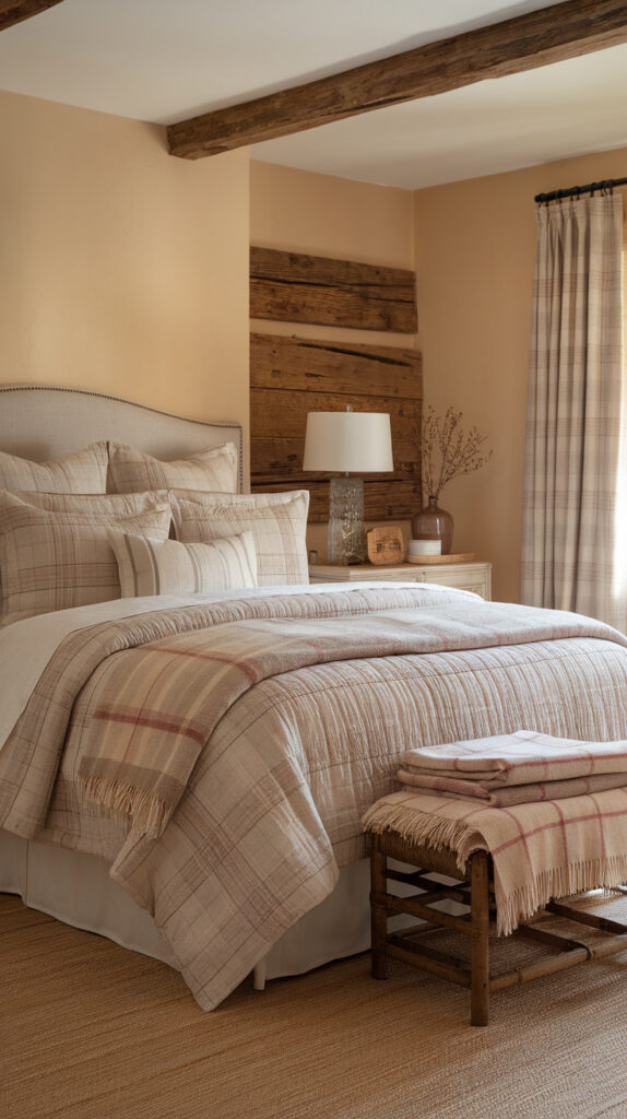 Choose one dominant neutral and one supporting accent tone before adding patterns. This keeps the room cohesive and prevents random country elements from clashing.