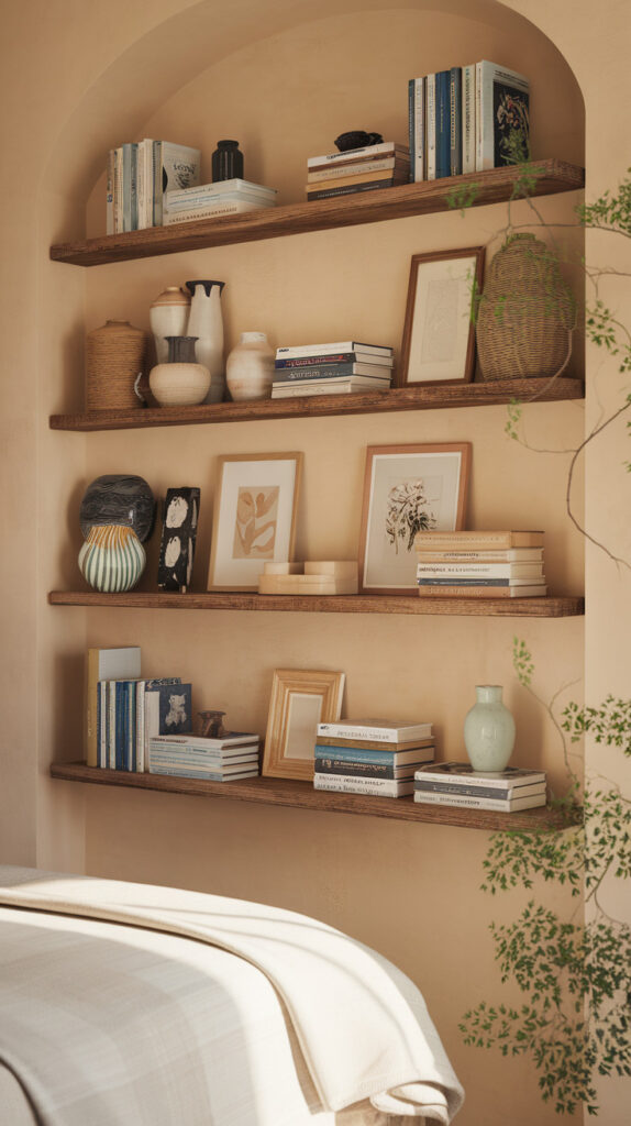 This includes quilts, throw blankets, baskets, and wall shelves. These pieces create warmth and variation in height and material.