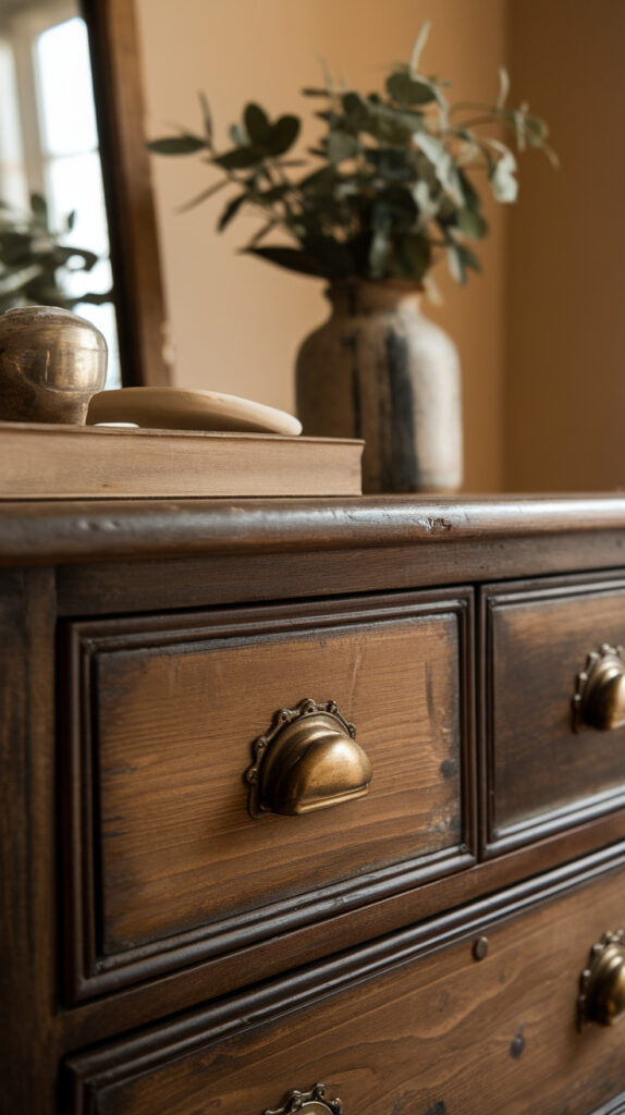 Avoid overly ornate hardware unless your bedroom is very traditional. Simple vintage-inspired knobs look cleaner and more modern-country.