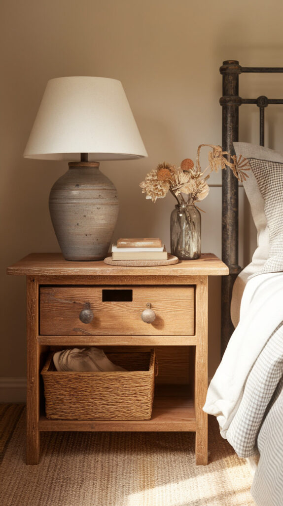 - Choose wood nightstands in oak, pine, walnut, or distressed finishes