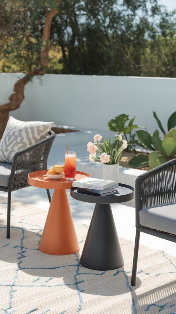A cozy patio needs places to set drinks, books, or snacks. I get irrationally annoyed when I have nowhere to place my cup, so side tables feel essential.