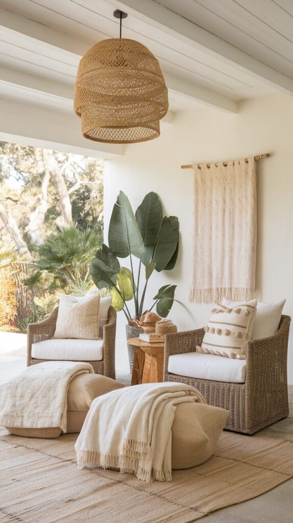 In cooler months, add thicker blankets and warm lighting. In warmer months, switch to lighter fabrics and breathable seating.