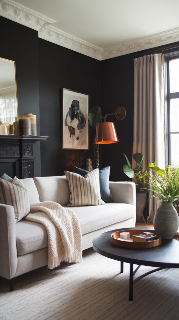 - Dark walls + light sofa