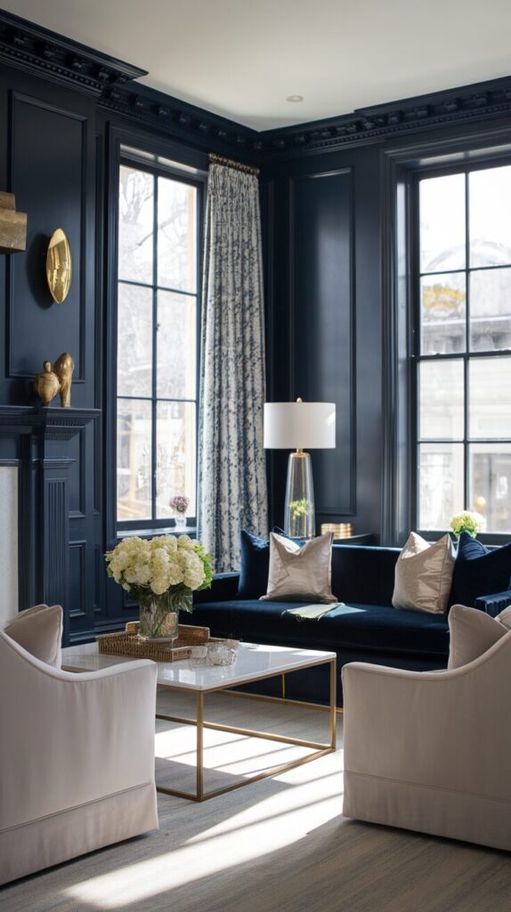 I like navy walls with crisp white trim because it sharpens the look instantly. Gold or brass accents also pop beautifully against deep blue. Even simple decor feels elevated when the walls carry this color.