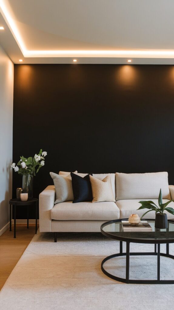 I usually recommend keeping the black wall behind a sofa or media unit. That placement anchors the room and keeps the darkness controlled. Matte finishes work best because they absorb light instead of reflecting it harshly.