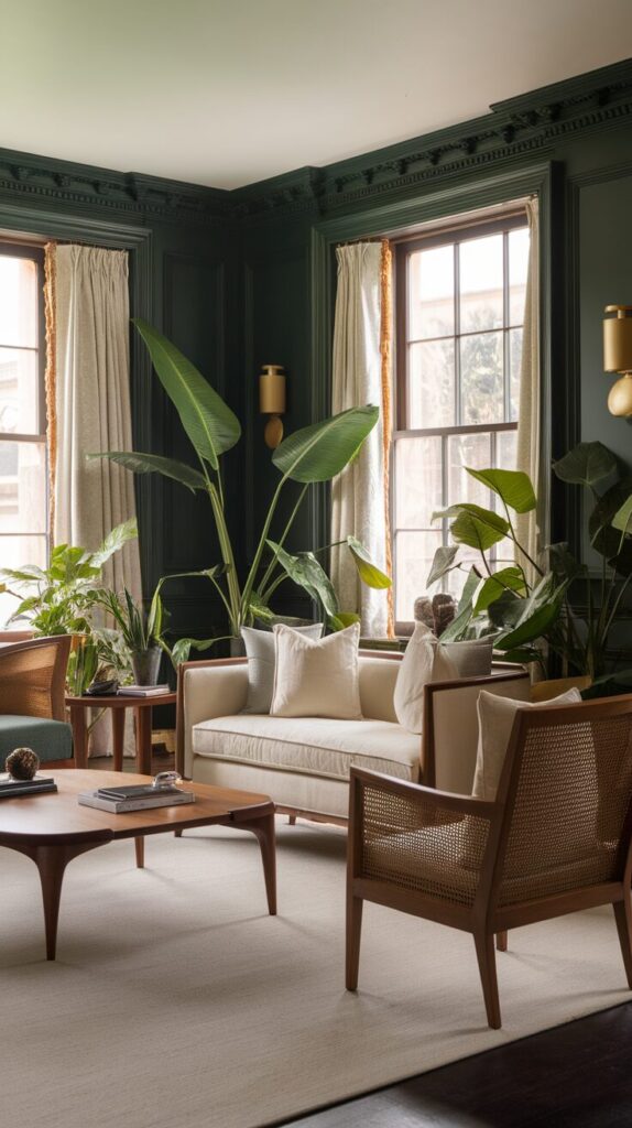 I love pairing dark green with warm wood furniture and neutral upholstery. The combination feels grounded and timeless. Even simple plants look extra lush against deep green walls.