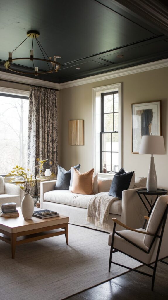 I prefer deep gray, navy, or charcoal instead of pure black for ceilings. These shades soften the effect while still adding depth. The ceiling starts to feel like part of the design instead of an afterthought.